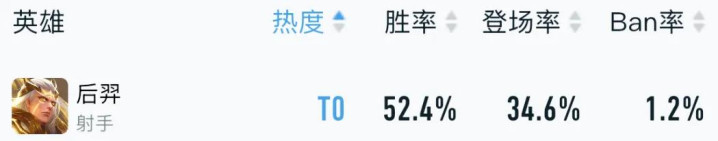后羿作为曾经的王S43赛季再次强势归来,胜率来到了52.4%登场率34.6%